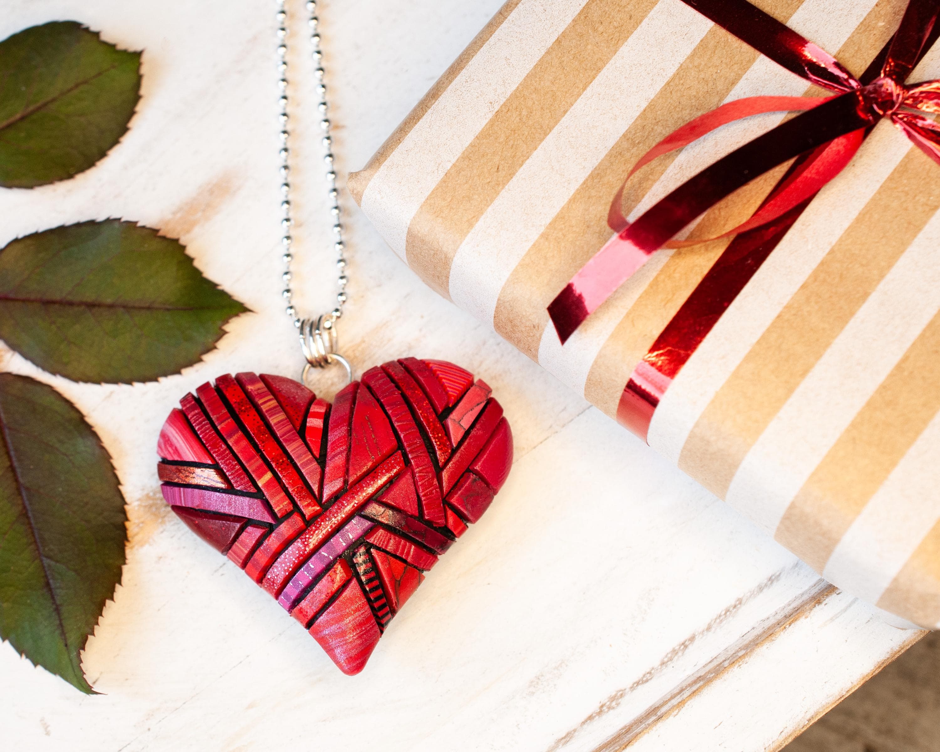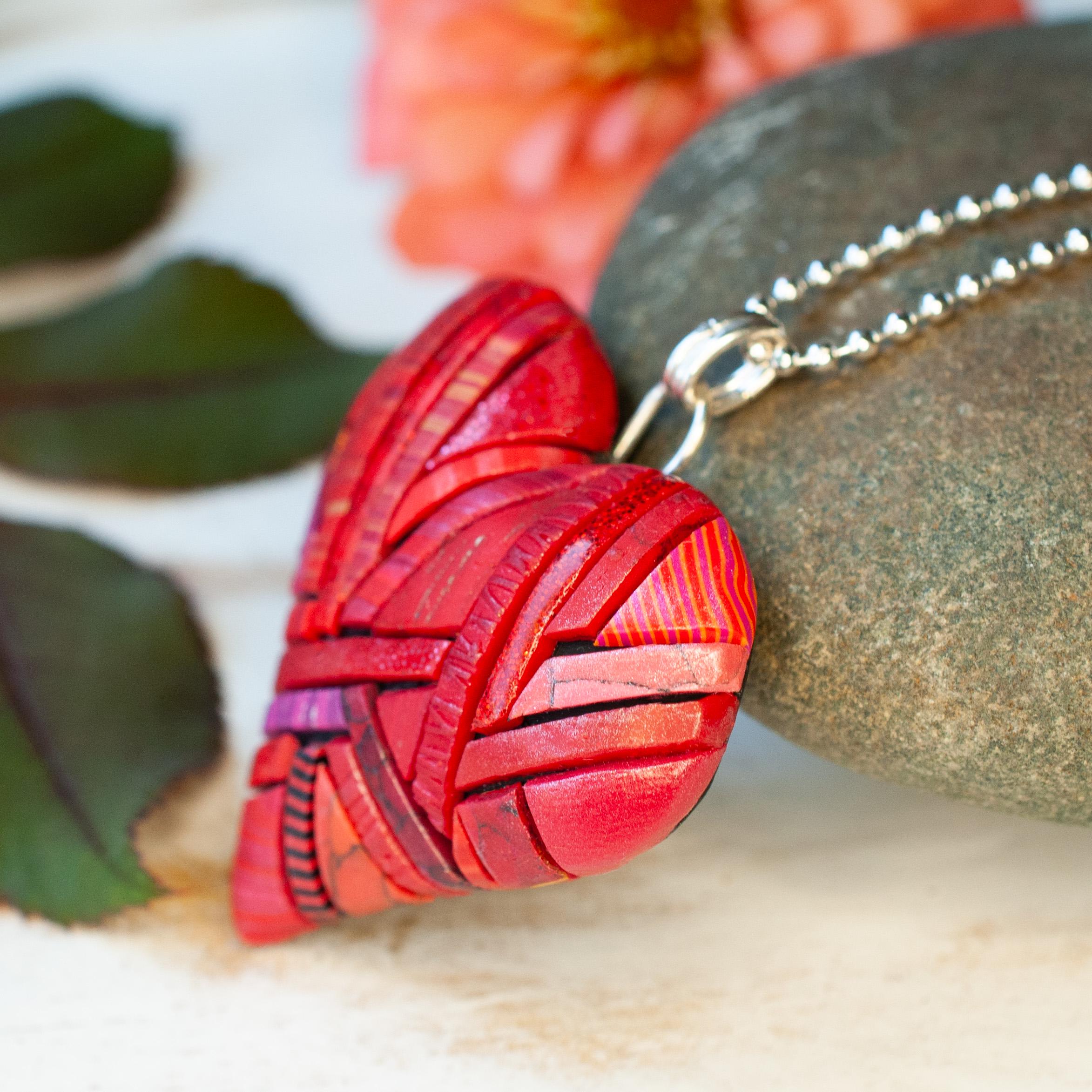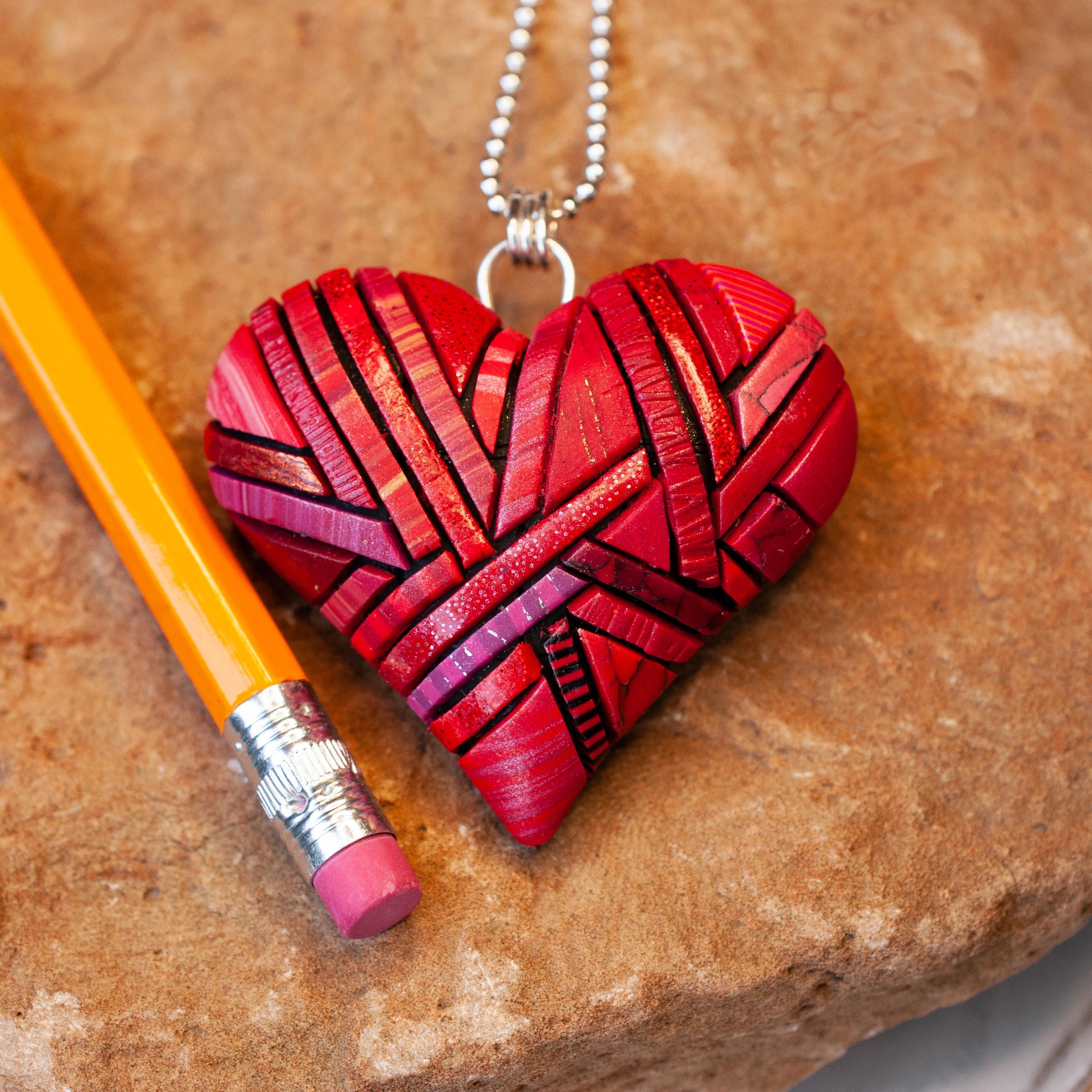 Bright red heart pendant on an 18" silver diamond-cut ball chain with lobster clasp makes a statement. It is a lovingly-handcrafted mosaic made from polymer clay. My signature blend of color, texture and shine will delight. Let your love show:)