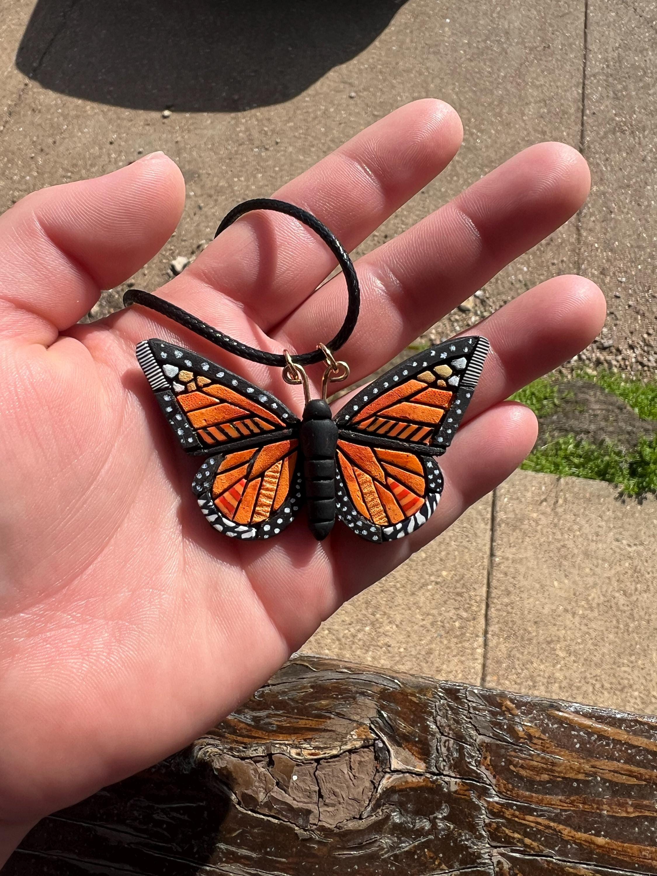 Monarch Butterfly necklace is a handmade micro-mosaic. It hangs from a 20" black cord with lobster clasp. It can also be worn at 18"