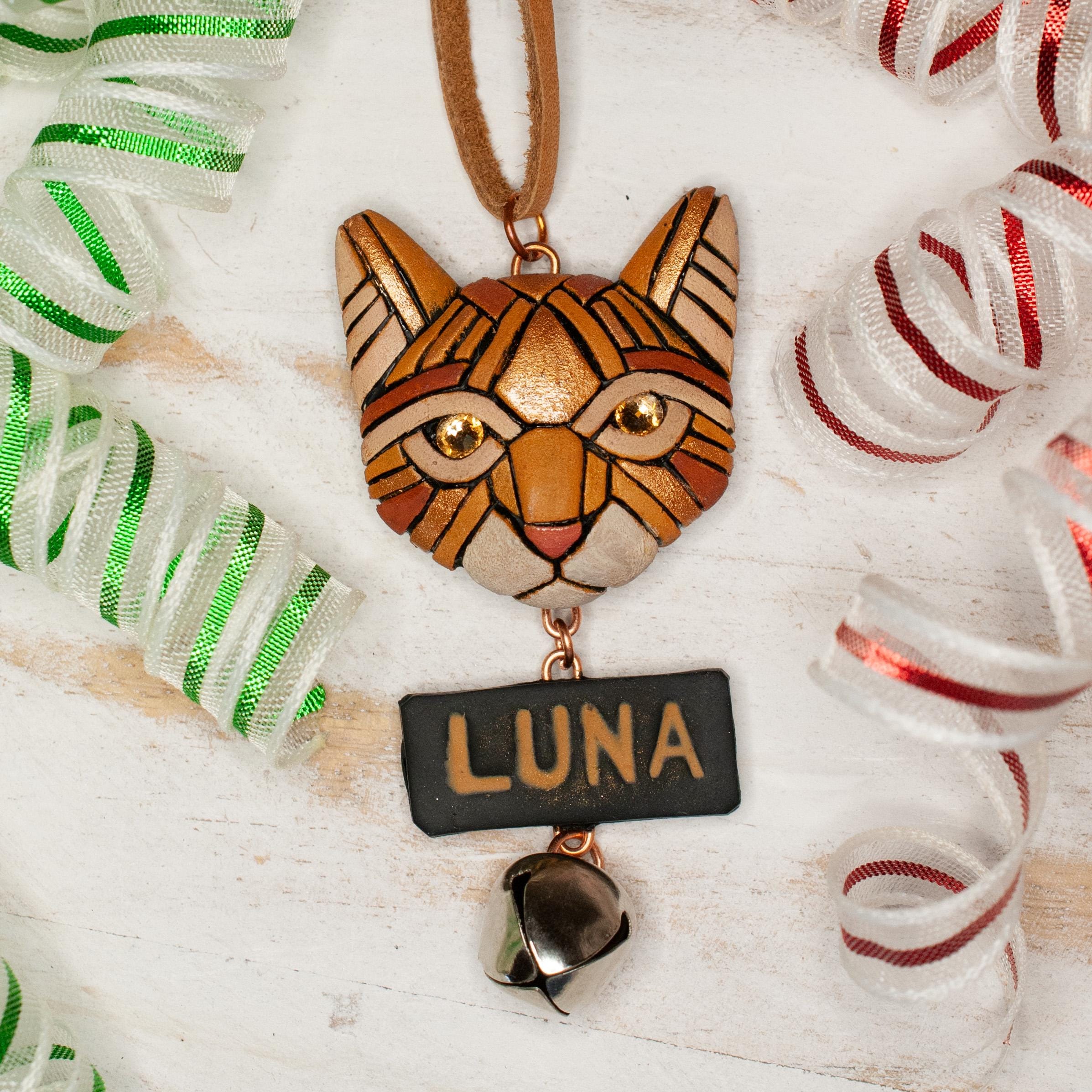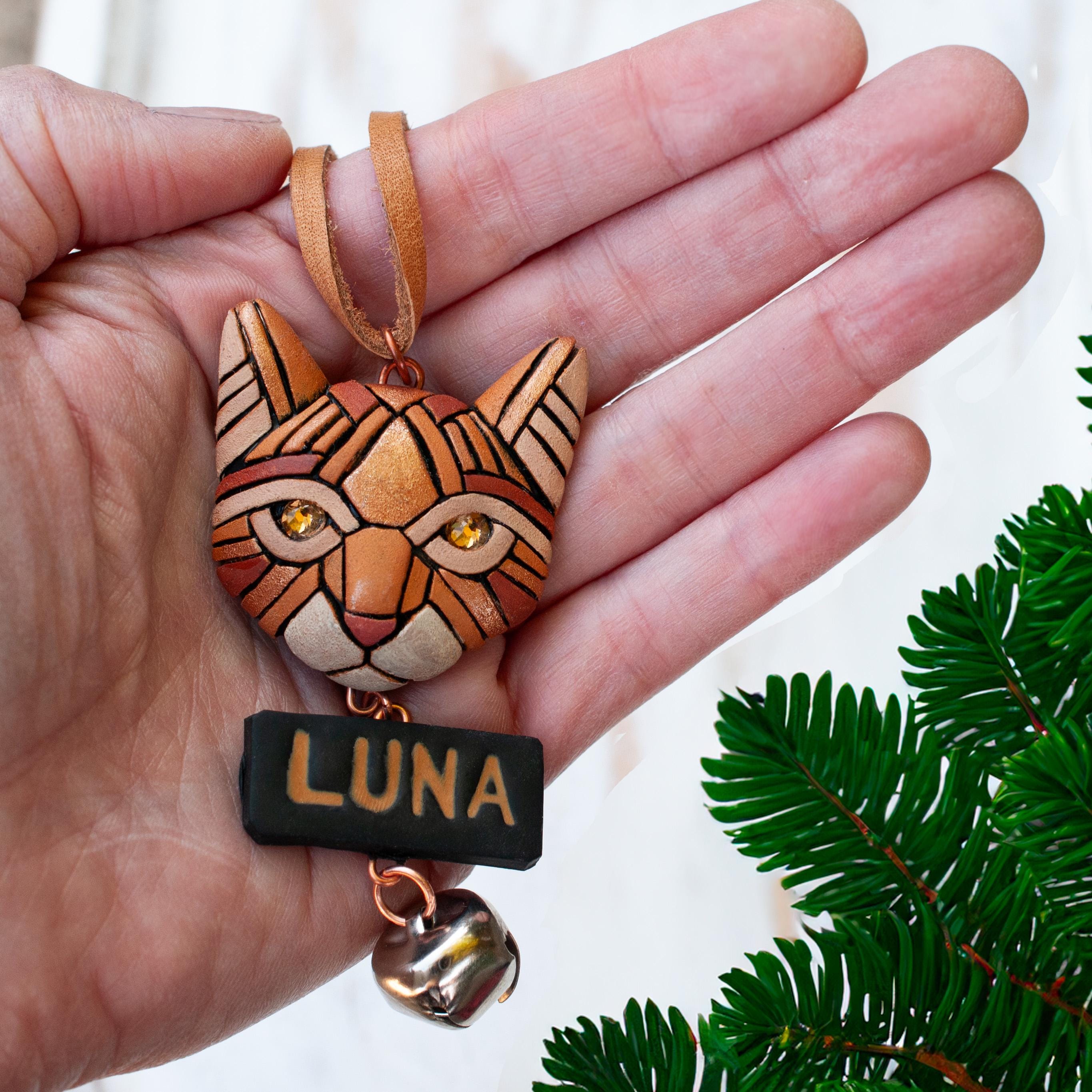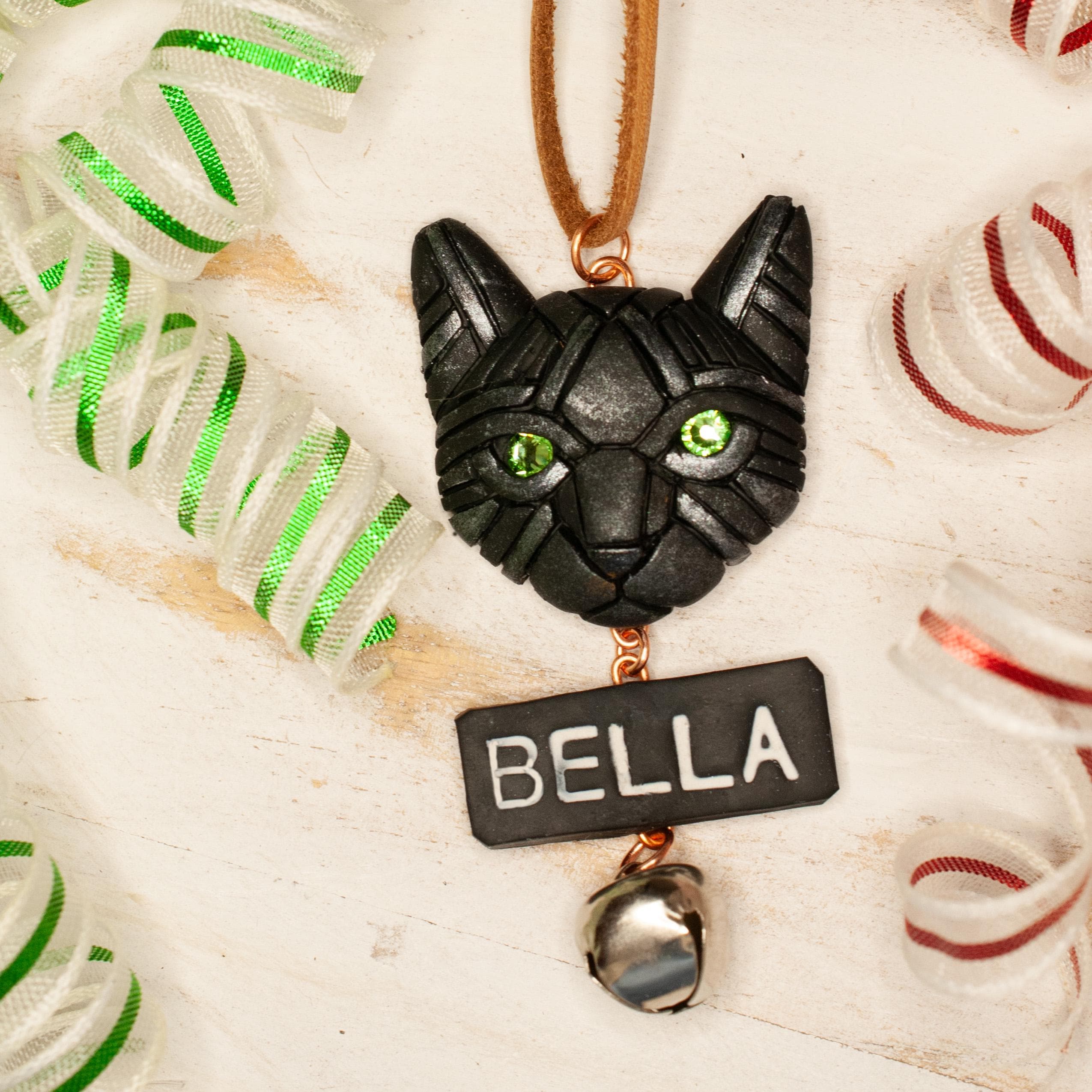 Handmade personalized cat ornament is a heartfelt keepsake for cat lovers and pet parents. This mosaic-style cat ornament is carefully crafted by Peoria artist Linda Webb of CreeksideMosaic, featuring a warm face with sparkling crystal eyes. A small black nameplate dangles below, hand-stamped with your cat’s name, and beneath it hangs a tiny silver bell that makes a soft festive jingle when moved.