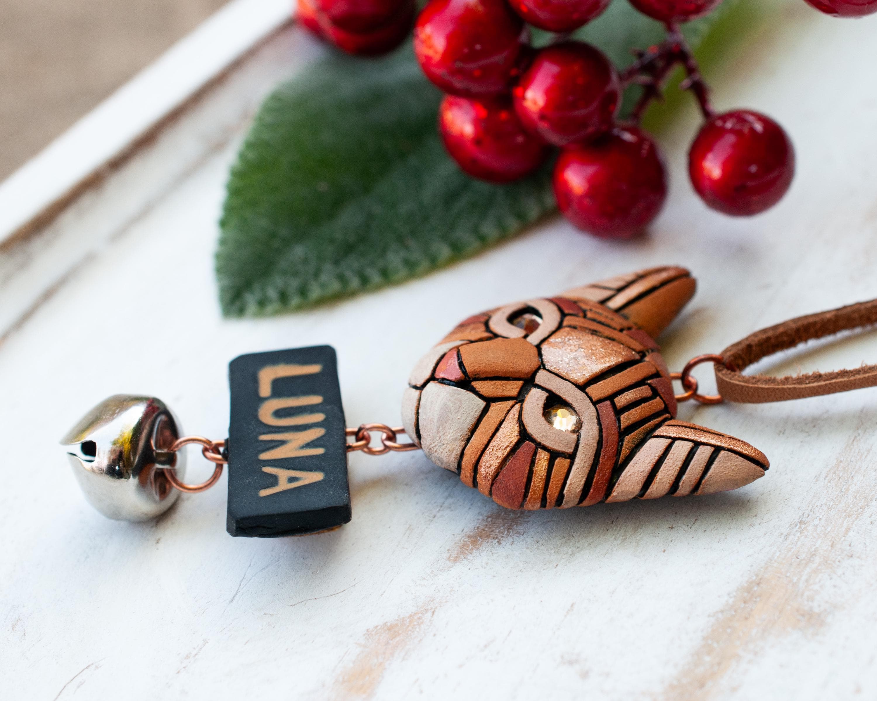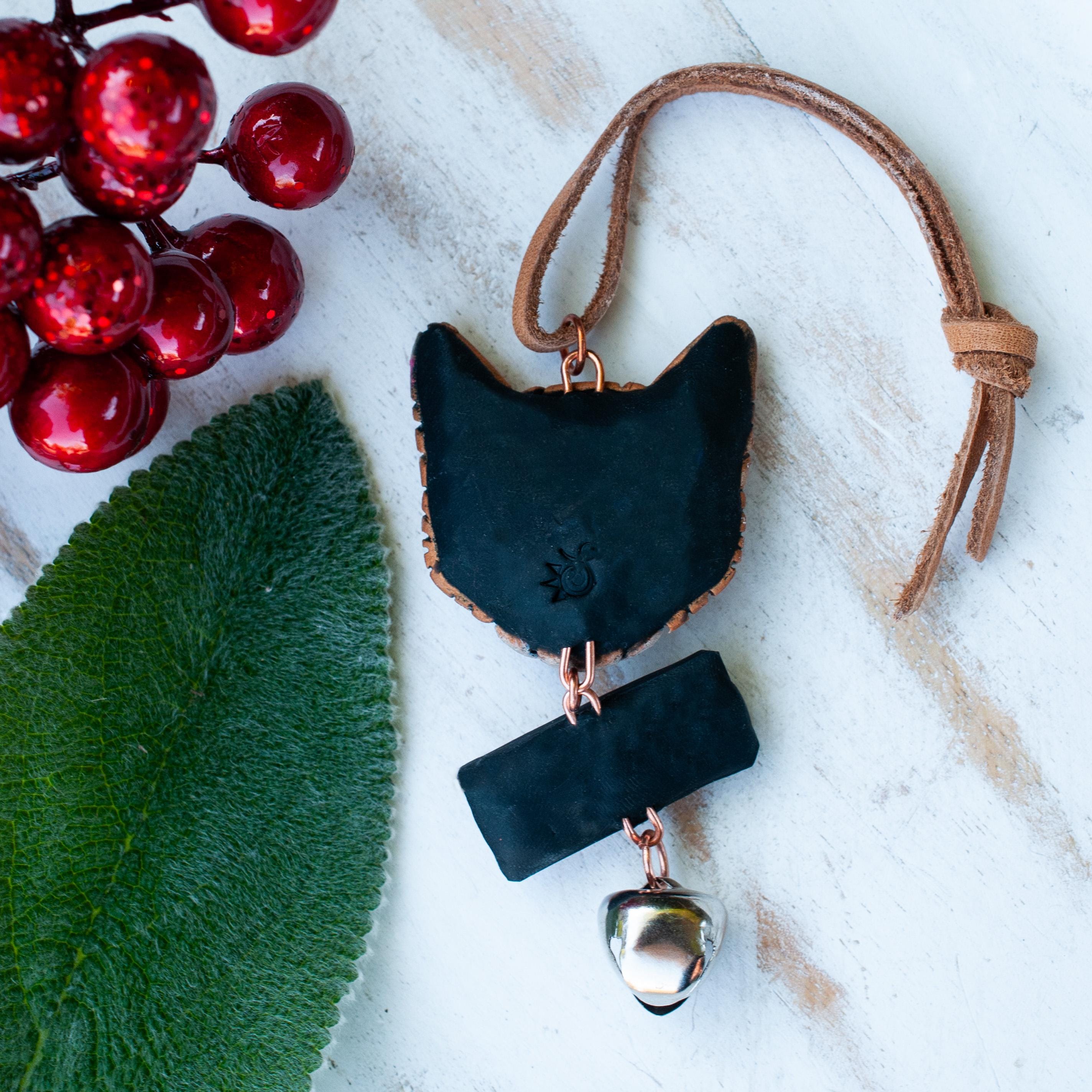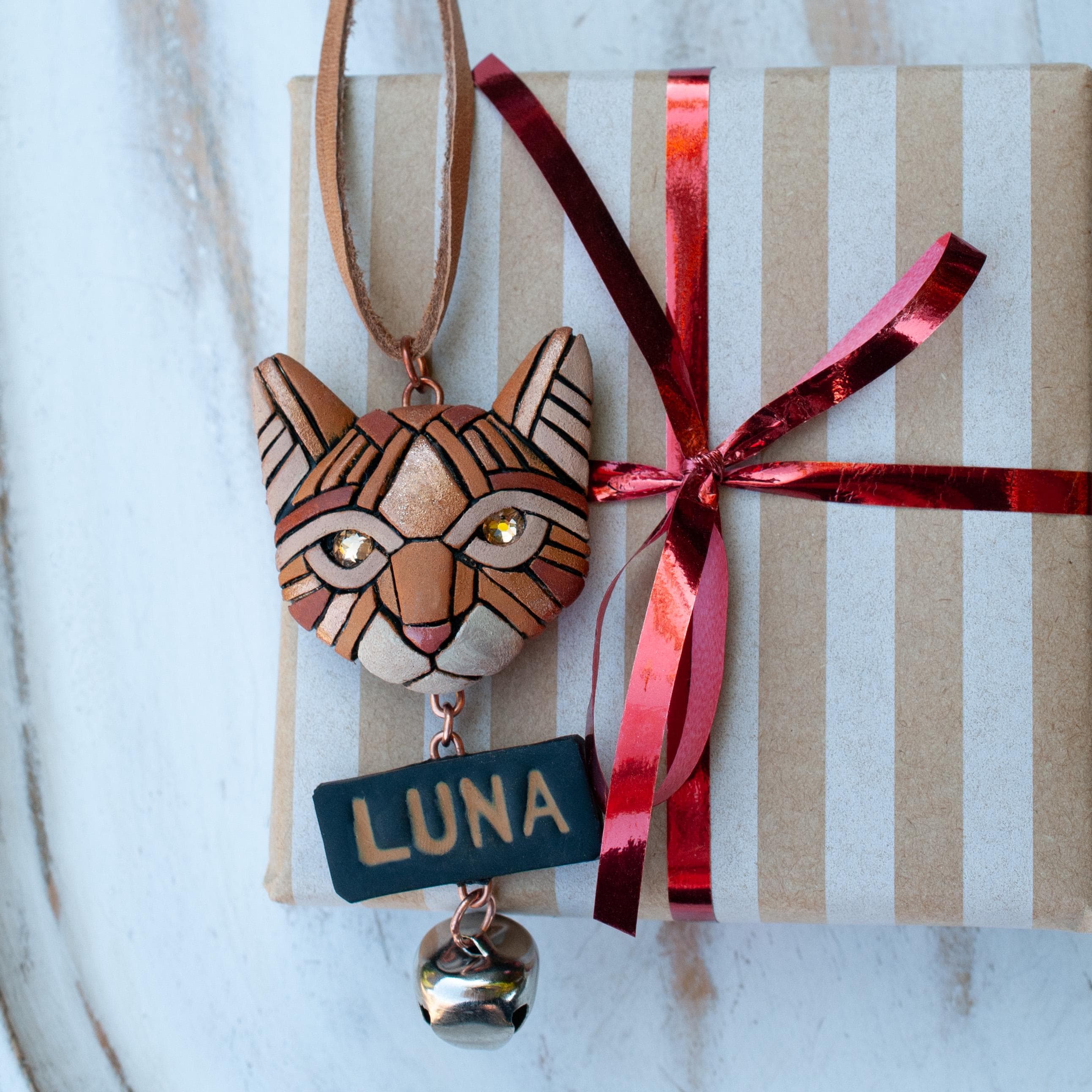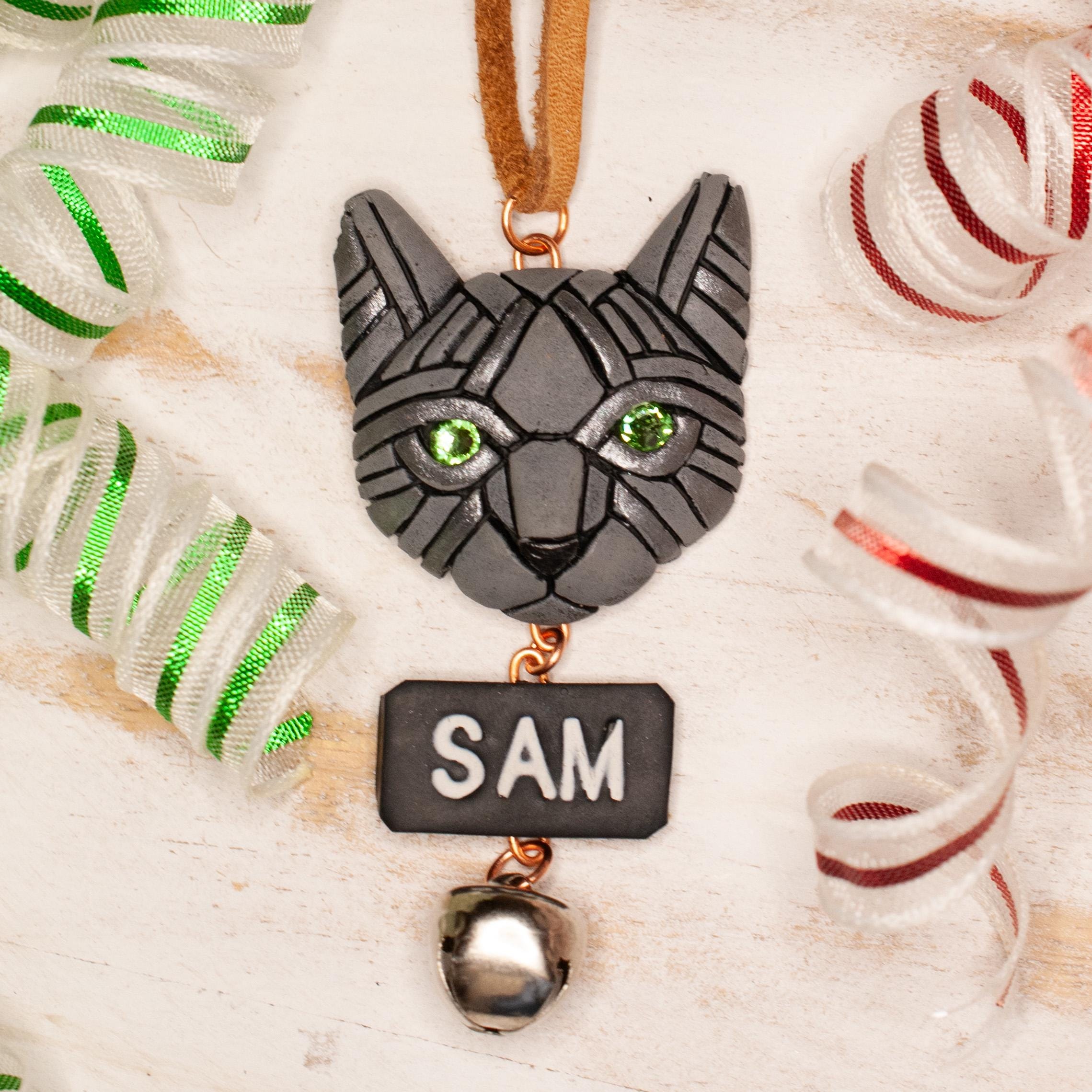 Handmade personalized cat ornament is a heartfelt keepsake for cat lovers and pet parents. This mosaic-style cat ornament is carefully crafted by Peoria artist Linda Webb of CreeksideMosaic, featuring a warm face with sparkling crystal eyes. A small black nameplate dangles below, hand-stamped with your cat’s name, and beneath it hangs a tiny silver bell that makes a soft festive jingle when moved.