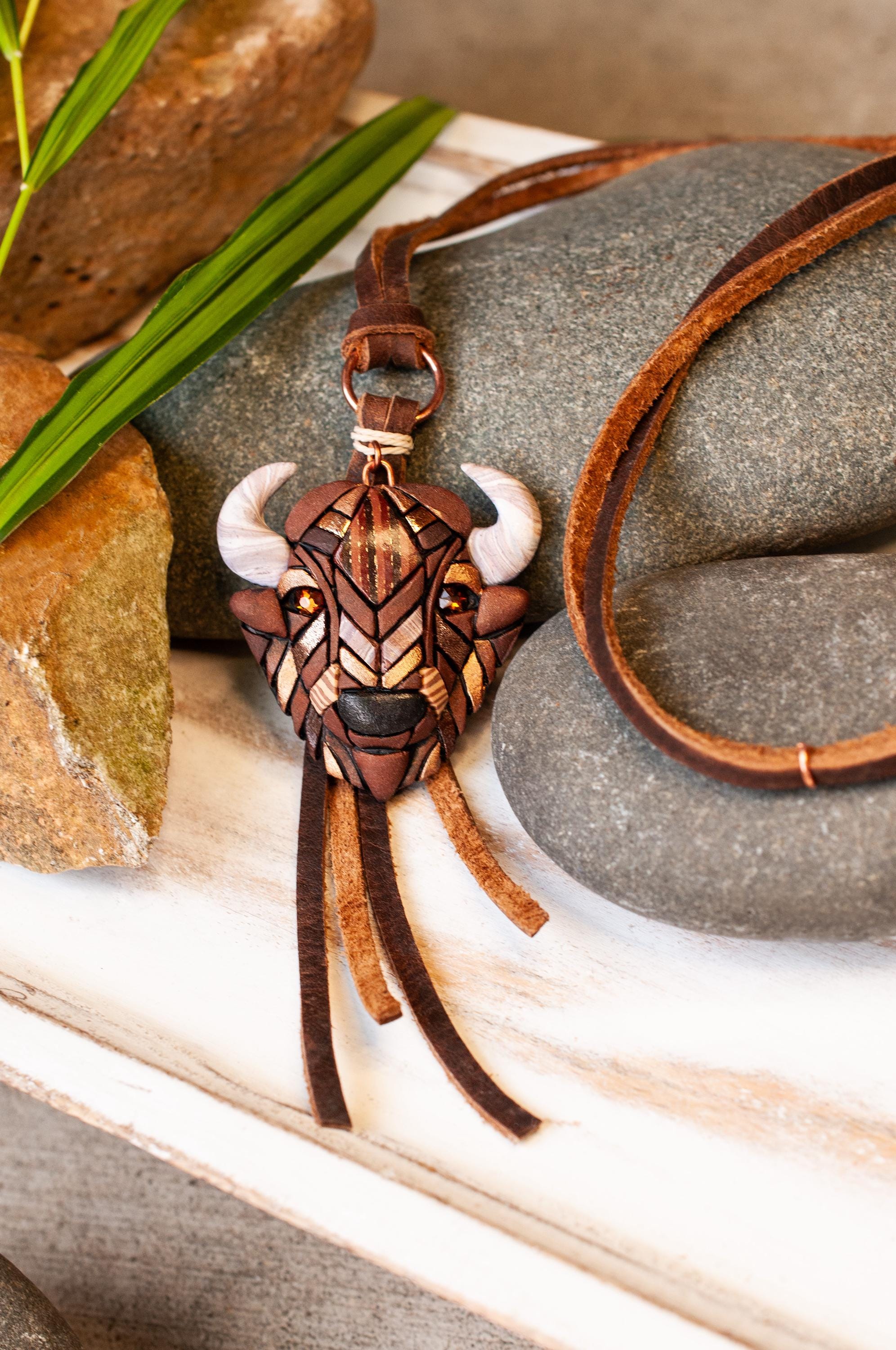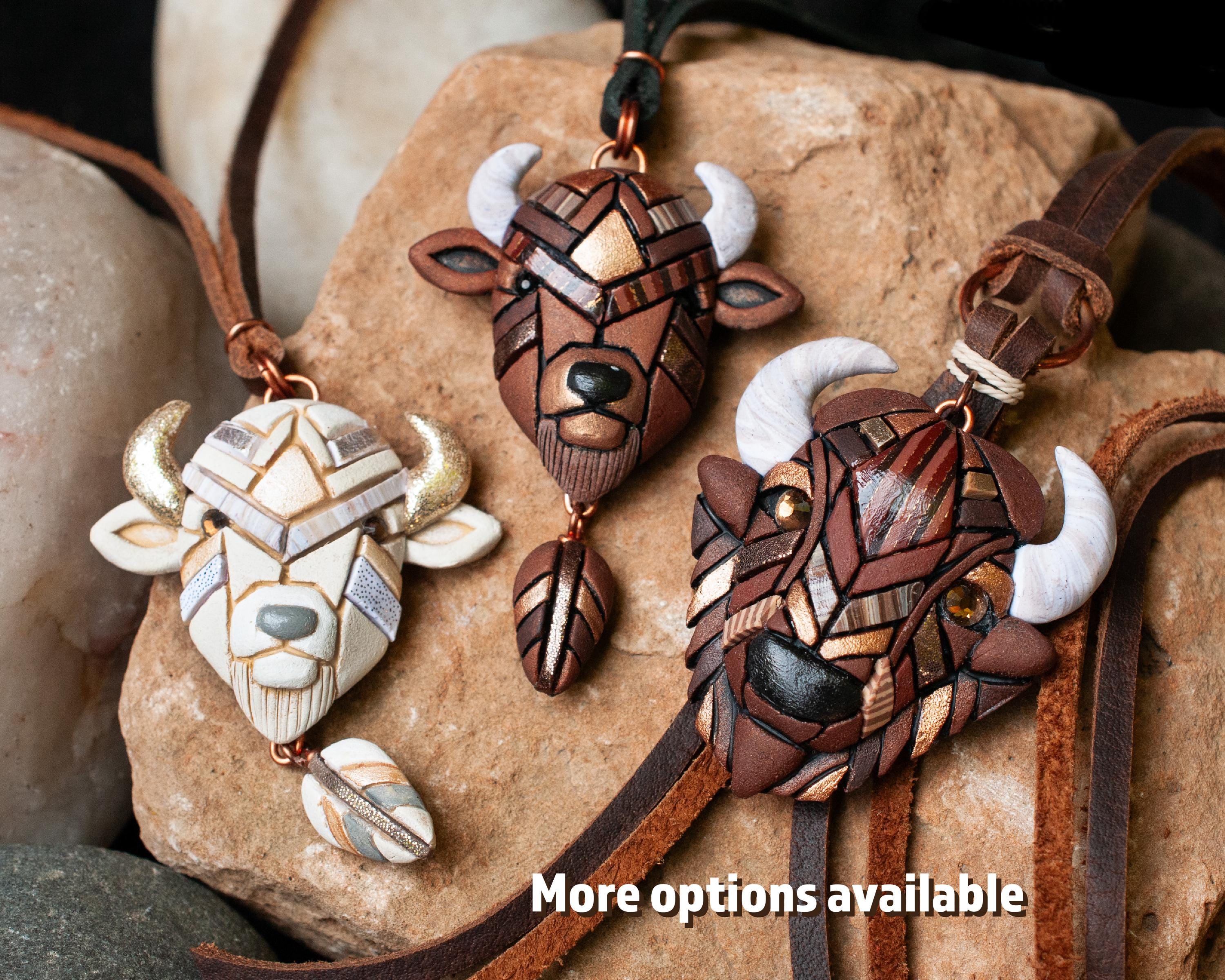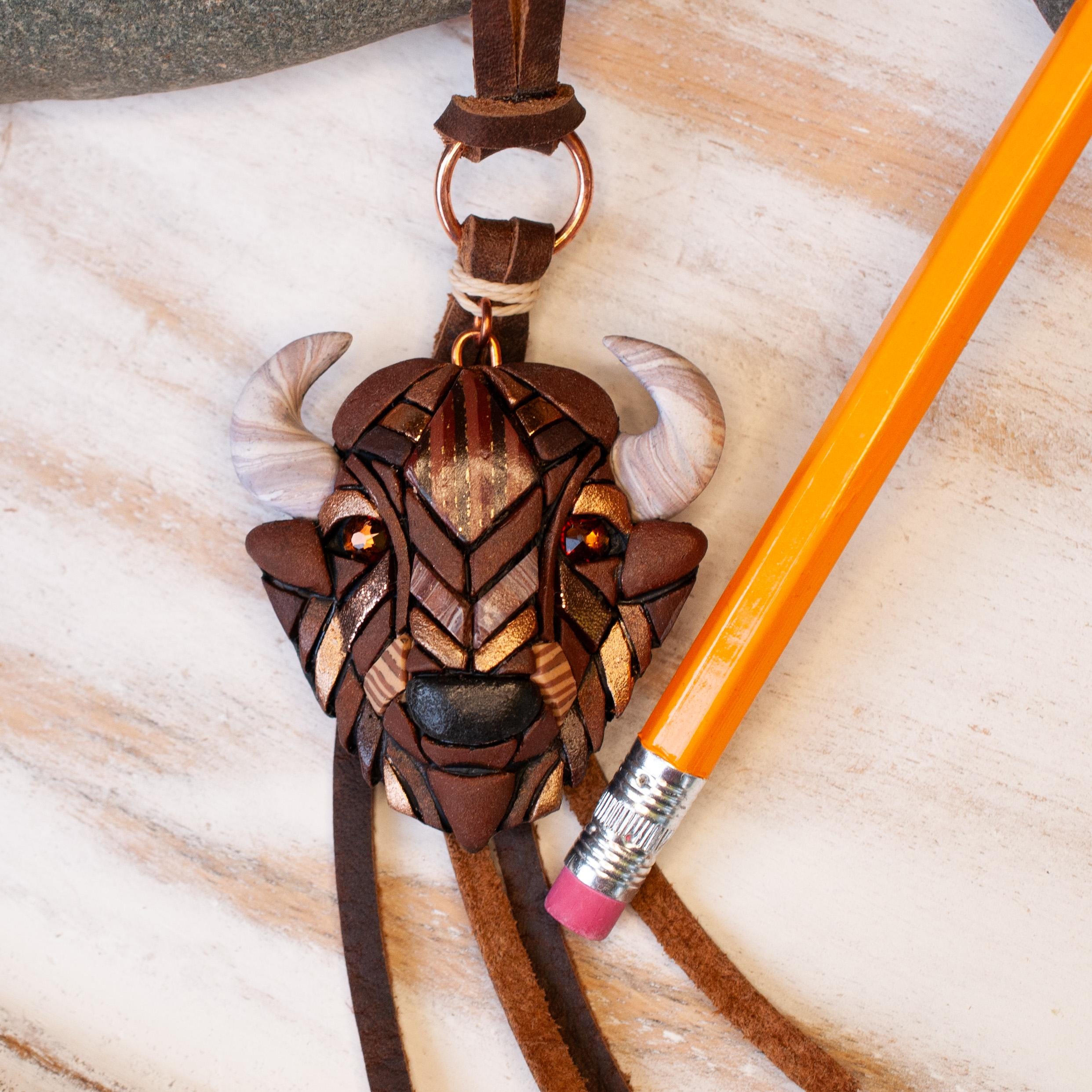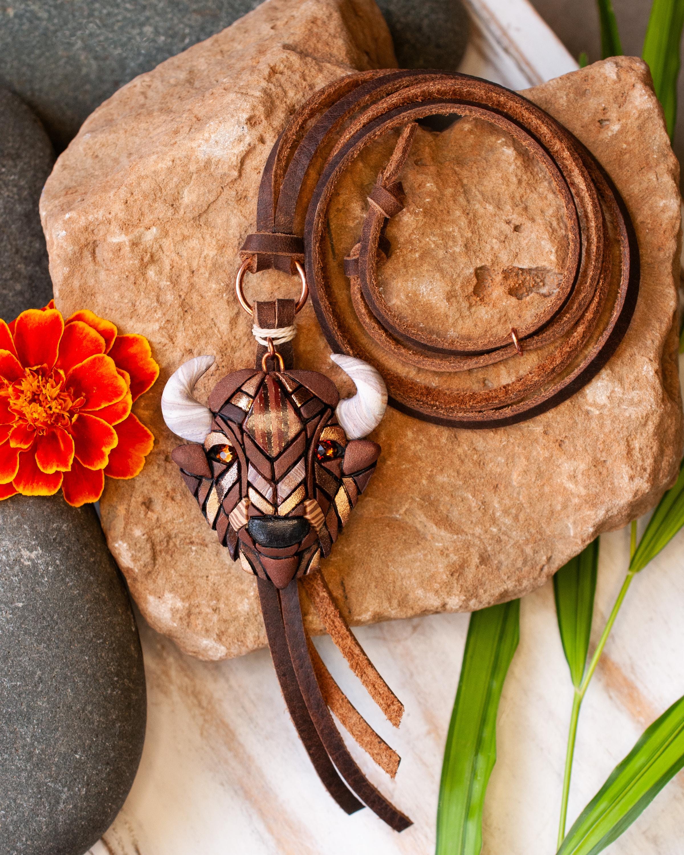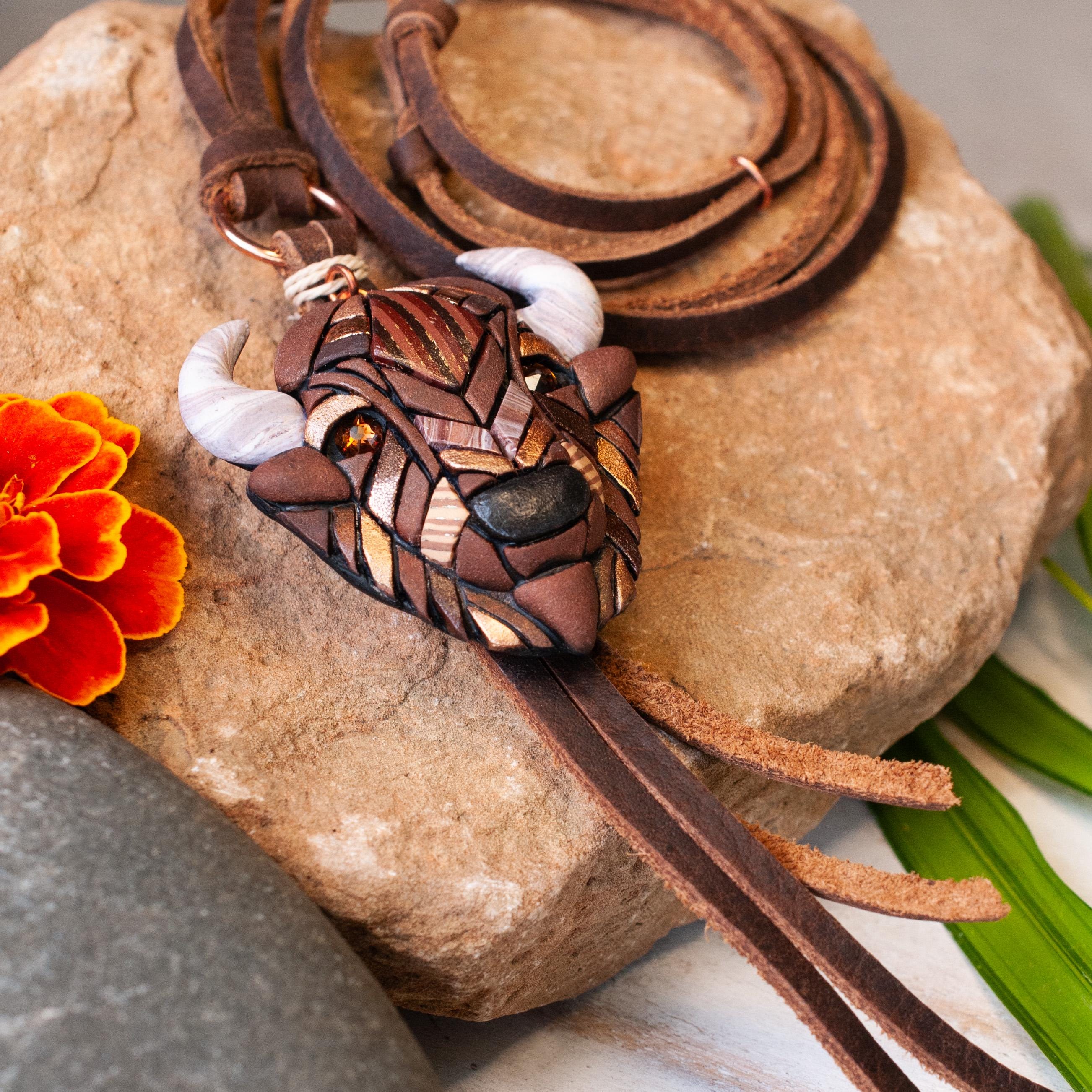 My bison / buffalo necklace on high-quality genuine leather cord makes a unique gift for anyone who loves native American animal species or western style. It is a handmade mosaic made from polymer clay.