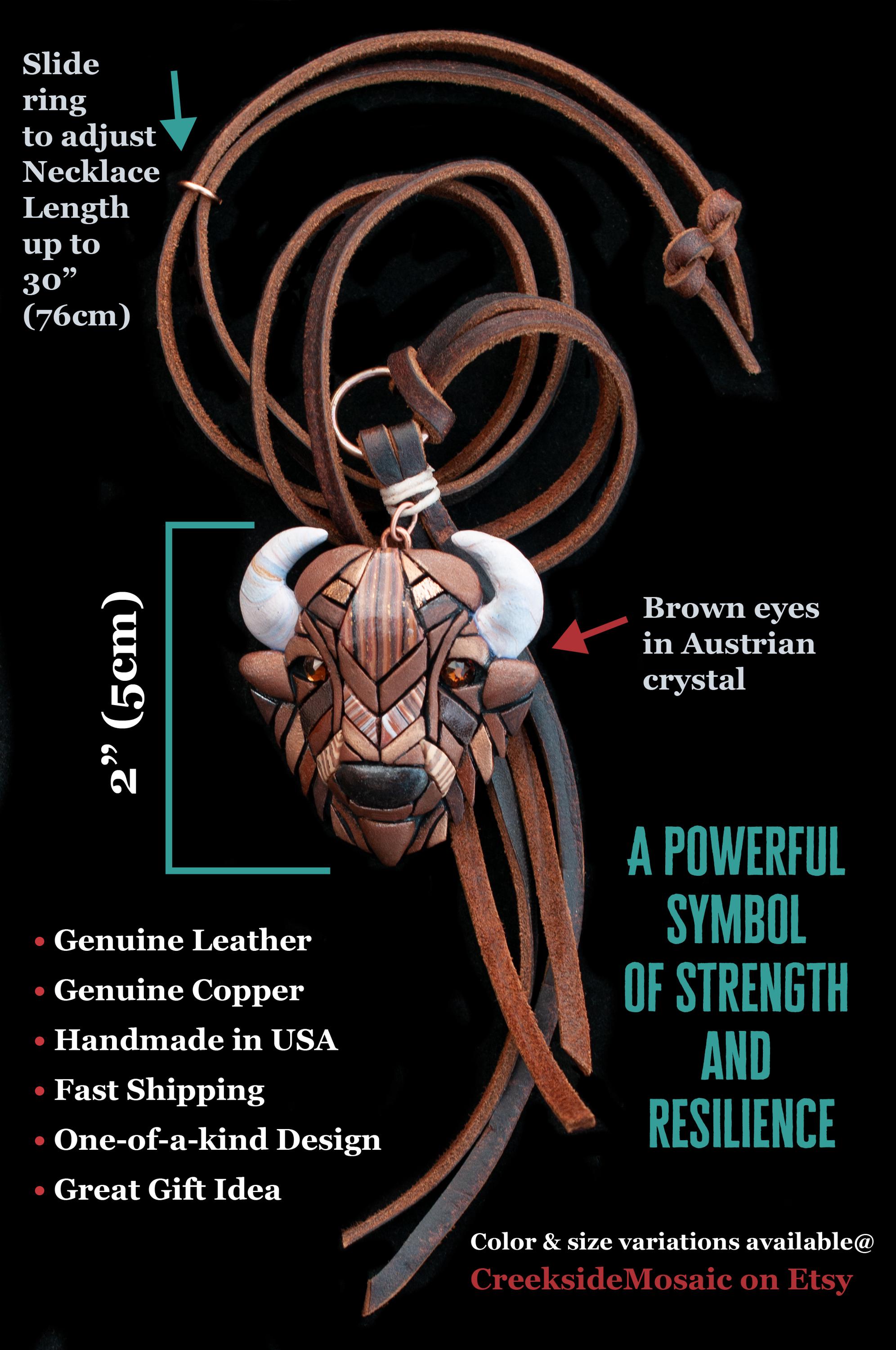 The lightweight pendant hangs from a soft, adjustable (from 16" to 30") brown leather cord with tassel. It is long enough to slip over your head making it easy to get on and off. The eyes sparkle with brown Swarovski crystals. Findings are copper. Bison symbolize many things including good health, strength, stamina and sometimes stubbornness:) Because each one is individually made, slight variations can be expected but all are top-quality.